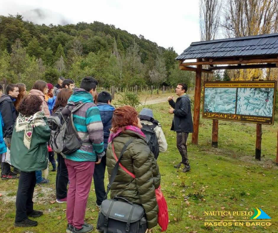 Luego de la charla informativa acerca del lugar, continuamos caminando hacia el Hito (estructura de metal con forma de torre de unos 3 metros de altura que en cuya cúspide tiene un cartel que de un lado se puede leer el nombre de Argentina y del otro lado Chile) que formalmente divide a los dos países. Seguiremos hacia la formación del Rio Puelo, que, debido al notable desnivel hacia el oeste, se producen unos rápidos maravillosos y de ahí comienza su descenso hacia el Océano Pacífico. Cabe destacar que el lago se encuentra a 200 msnm y el Rio Puelo recorre unos 90 km hasta desembocar en el Estuario de Reloncaví (Chile). Finalizada la caminata y llenas nuestras almas de naturaleza, embarcamos y ya relajados emprendemos el regreso a puerto cabecera norte del Lago Puelo.
